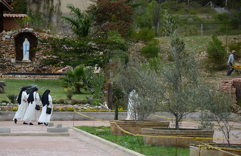 Percibimos a Dios desde el clarear del nuevo día, cuando vamos a la capillita del Monasterio San José Obrero para la primera oración, hasta el grato llegar del atardecer a las 5:30 ´pm, cuando suena la campana del monasterio o también la campana de la ermita de san Francisco, para que vayamos a comenzar el rezo del rosario. Nos vamos reuniendo y empezamos con el primer misterio en la gruta de la Virgen de Lourdes y luego caminamos alrededor de toda la ciudad de Dios, por “El camino del Rosario”. A esa hora, las garzas van llegando a posarse sobre los pinos y también algunos chulos, sin que, de cuando en cuando, dejen de visitarnos tres guacamayas que con estridente ruido se posan sobre la copa de los árboles para intentar pasar la noche allí, al parecer sin dejar dormir a las otras aves, pues el ruido que hacen es enorme.